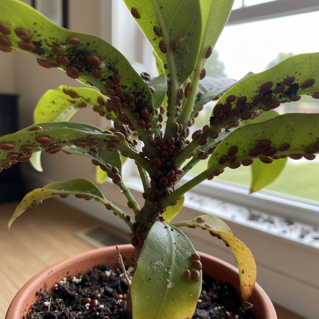 Look for small, raised bumps on plant stems and leaves. Infested plants may exhibit yellowing leaves, stunted growth, or a sticky substance called honeydew, which can attract ants and promote sooty mold growth. In severe infestations, plants may experience leaf drop or even death.