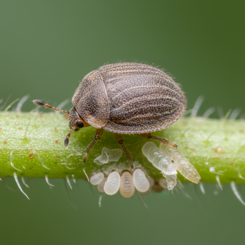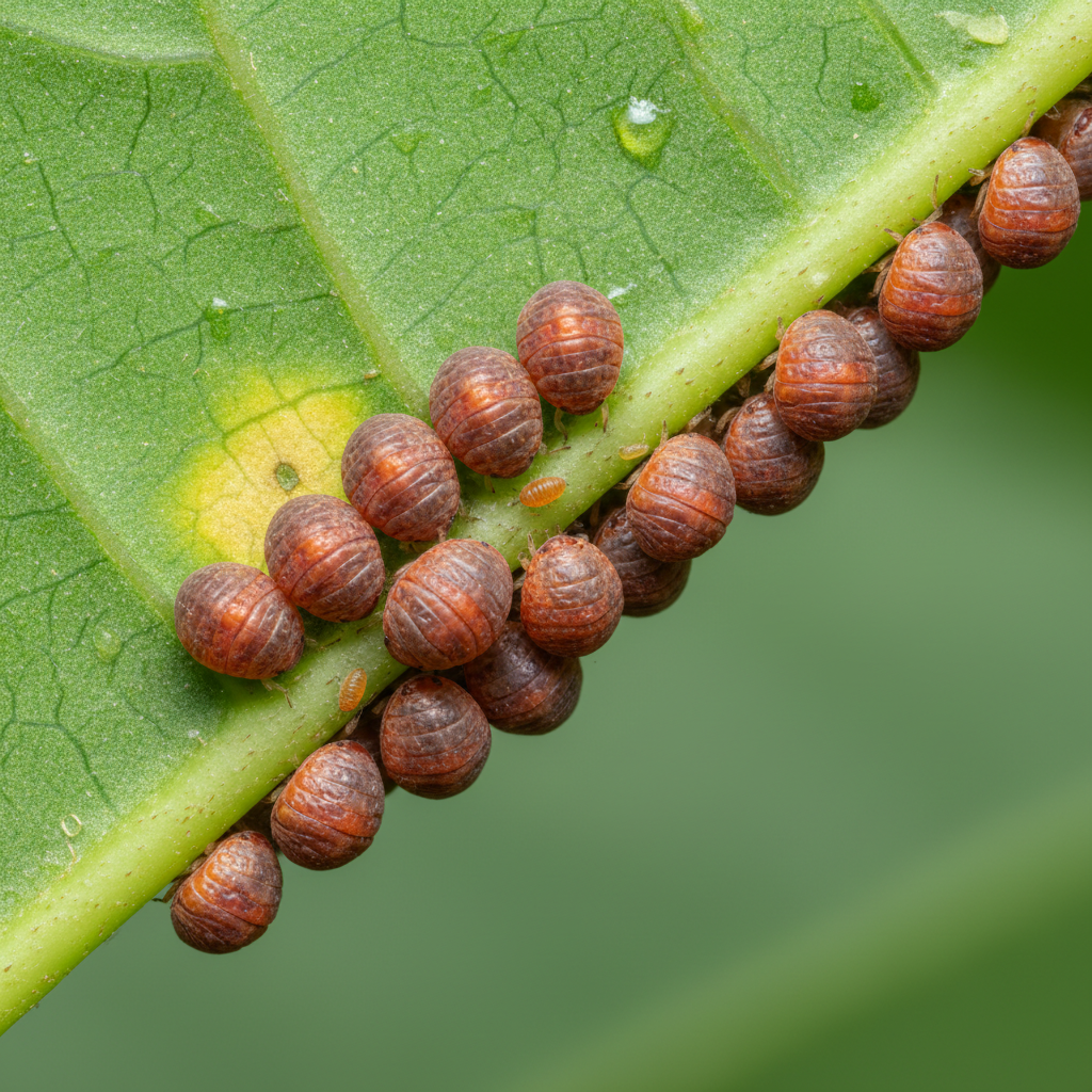 Scale insects are small, sap-sucking pests often resembling bumps or scales on plant stems and leaves. They can vary in color from white and gray to brown and black, and are typically immobile in their adult stage, protected by a waxy or armored covering.