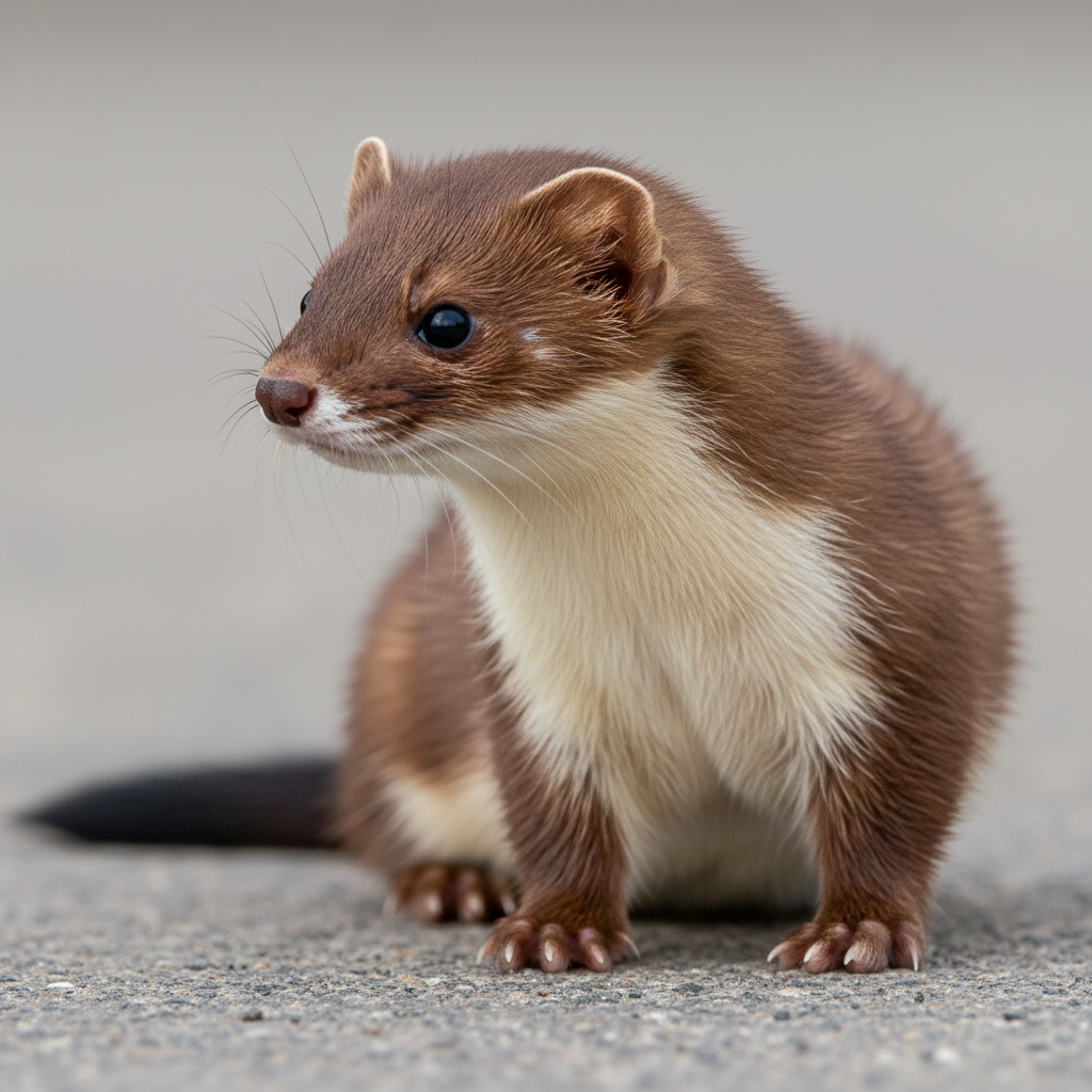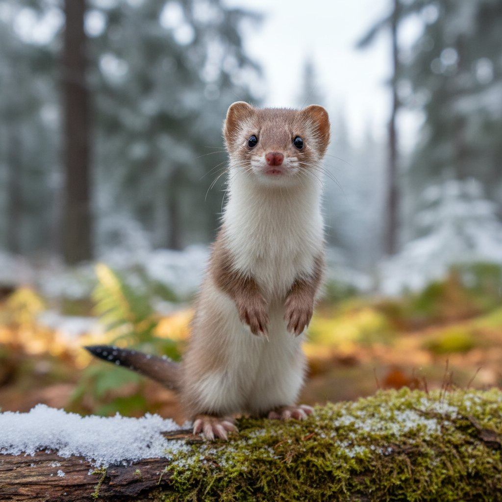 The short-tailed weasel, also known as an ermine, is a small mammal with a slender body and short legs. In summer, its coat is brown with a white belly, while in winter, it turns completely white except for the black tip of its tail. They are typically 7-12 inches long, including the tail.