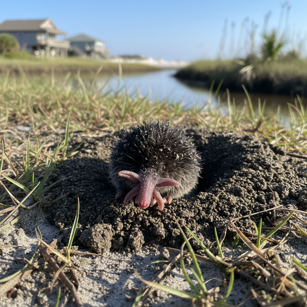 Star-nosed moles prefer wet, poorly drained soils near marshes, streams, and ponds, which are common habitats along the South Carolina coast. They are well-adapted to the humid subtropical climate and sandy soils of the Grand Strand. Their presence is more likely in areas with abundant earthworms and insects.