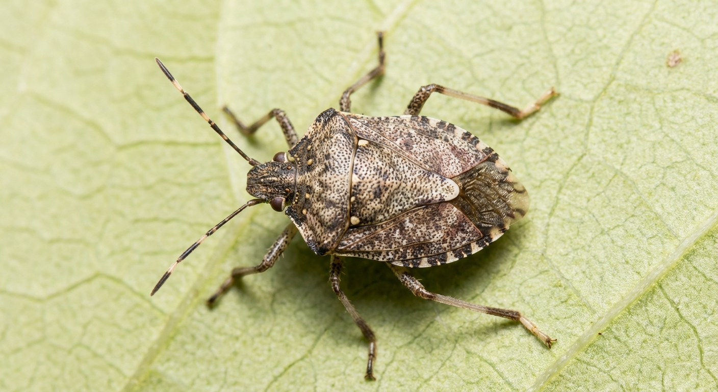 Brown marmorated stink bugs are shield-shaped insects about 5/8 inch long with a mottled brown and gray pattern. Key identifying features include alternating light and dark banding on the antennae and along the edges of the abdomen. They have a characteristic shield or heraldic shape when viewed from above. When disturbed or crushed, they release a pungent, cilantro-like odor from scent glands on the thorax. They are strong fliers and are attracted to warm surfaces and lights.