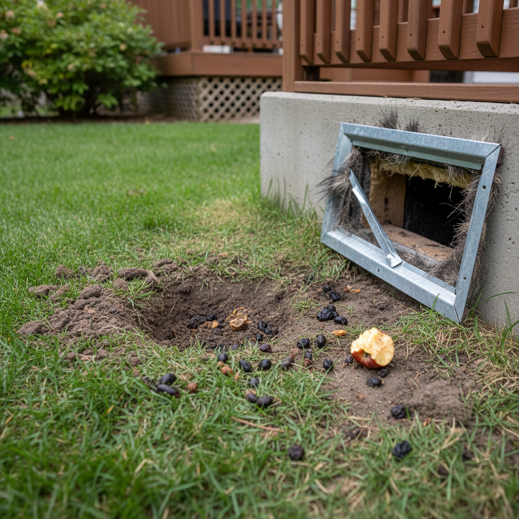 Skunks may dig shallow holes in lawns while searching for grubs and insects. You might notice a strong, musky odor, especially if a skunk has sprayed nearby. They may also den under porches, decks, or sheds.
