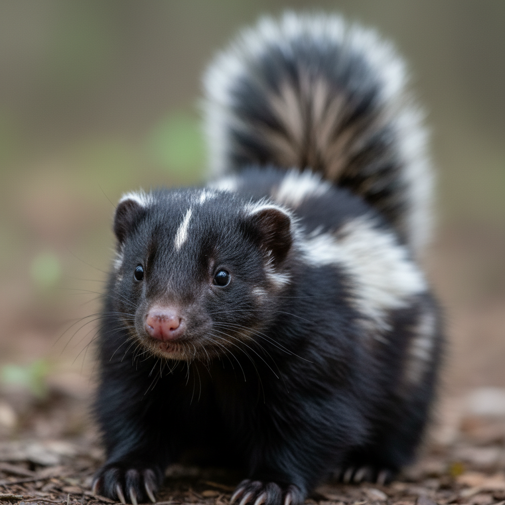 Striped skunks are easily recognized by their black fur and prominent white stripes running down their back and tail. They are about the size of a house cat, with a bushy tail and a small, triangular head. They possess strong claws for digging.