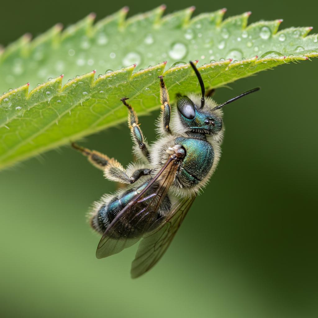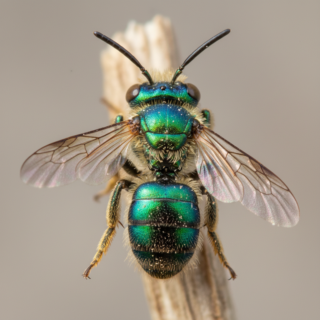 Sweat bees are small, metallic-colored bees, often green, blue, or bronze. They range from 1/8 to 1/2 inch long. Unlike honeybees, they are typically solitary or semi-social and nest in the ground.
