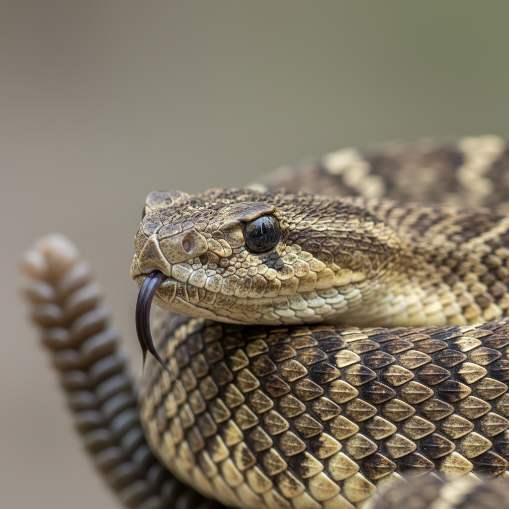 The timber rattlesnake is a large, heavy-bodied snake with a distinctive triangular head and a rattle on its tail. They typically have a pattern of dark chevrons or bands on a gray or tan background, and can reach lengths of 3-5 feet.
