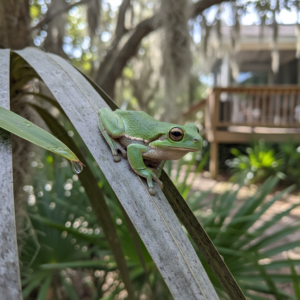 The most common sign is their distinctive call, especially during warm, humid evenings near standing water. You may also find them clinging to windows, siding, or vegetation near your Myrtle Beach home. While not an infestation in the traditional sense, large numbers can be a nuisance.