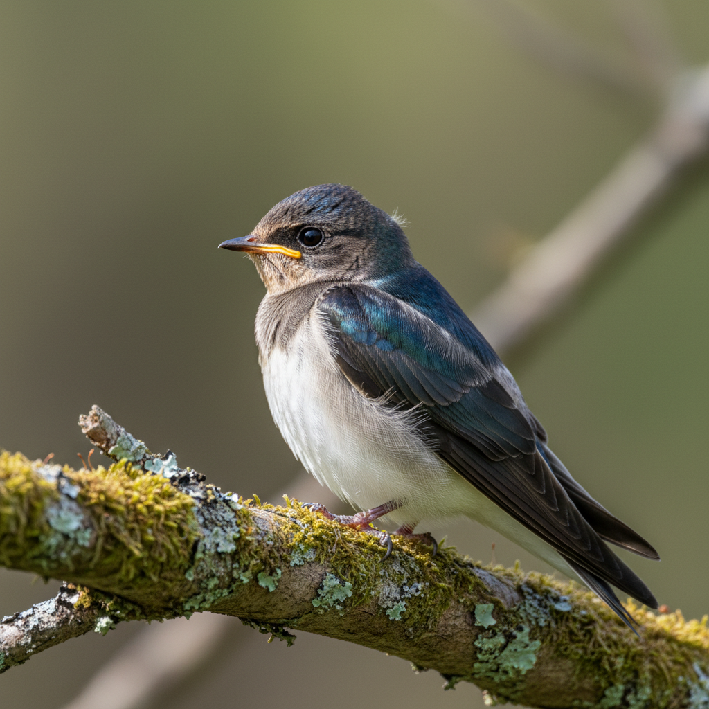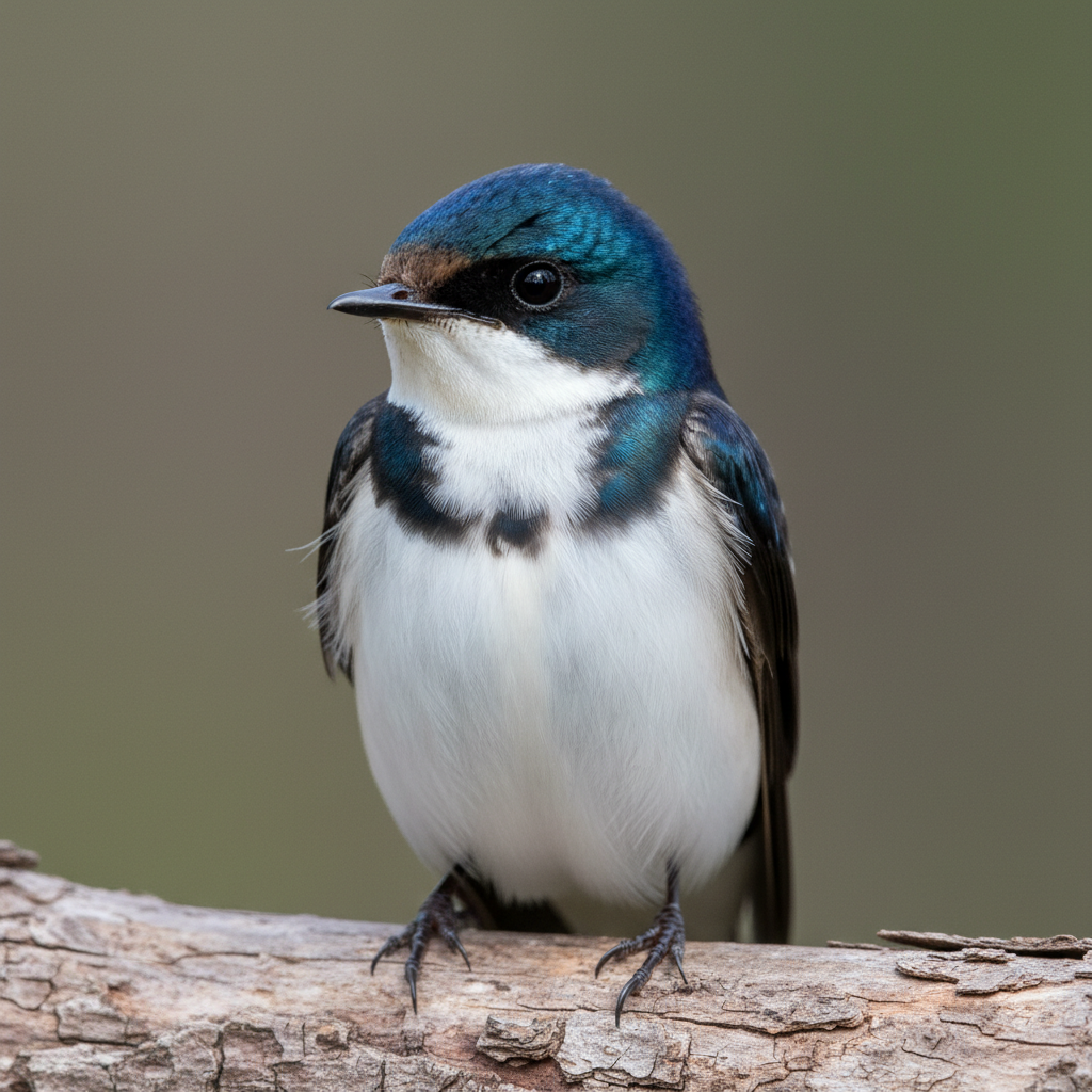 Tree Swallows are small songbirds with iridescent blue-green backs and pure white underparts. They have short, forked tails and pointed wings, perfectly adapted for aerial acrobatics. Juvenile birds are duller brown above, gradually acquiring their adult plumage.
