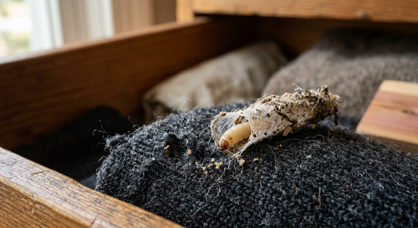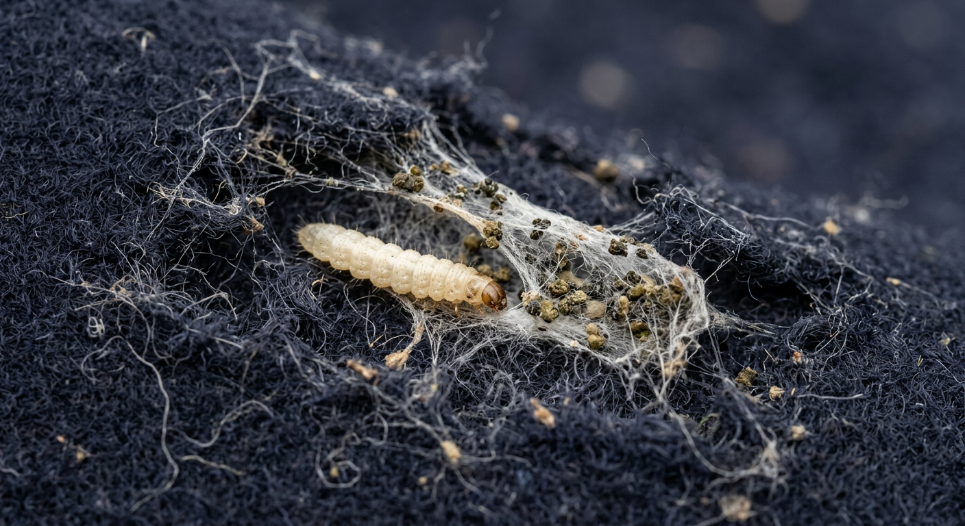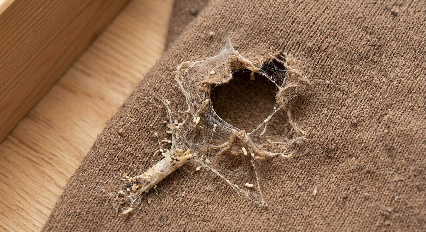 Look for irregular holes in clothing, carpets, upholstery, or other textiles made of natural fibers like wool, silk, or fur. You may also find silken webbing, larval casings, or frass (larval droppings) in closets, drawers, or storage areas. In Myrtle Beach homes, check dark, undisturbed areas where these items are stored.