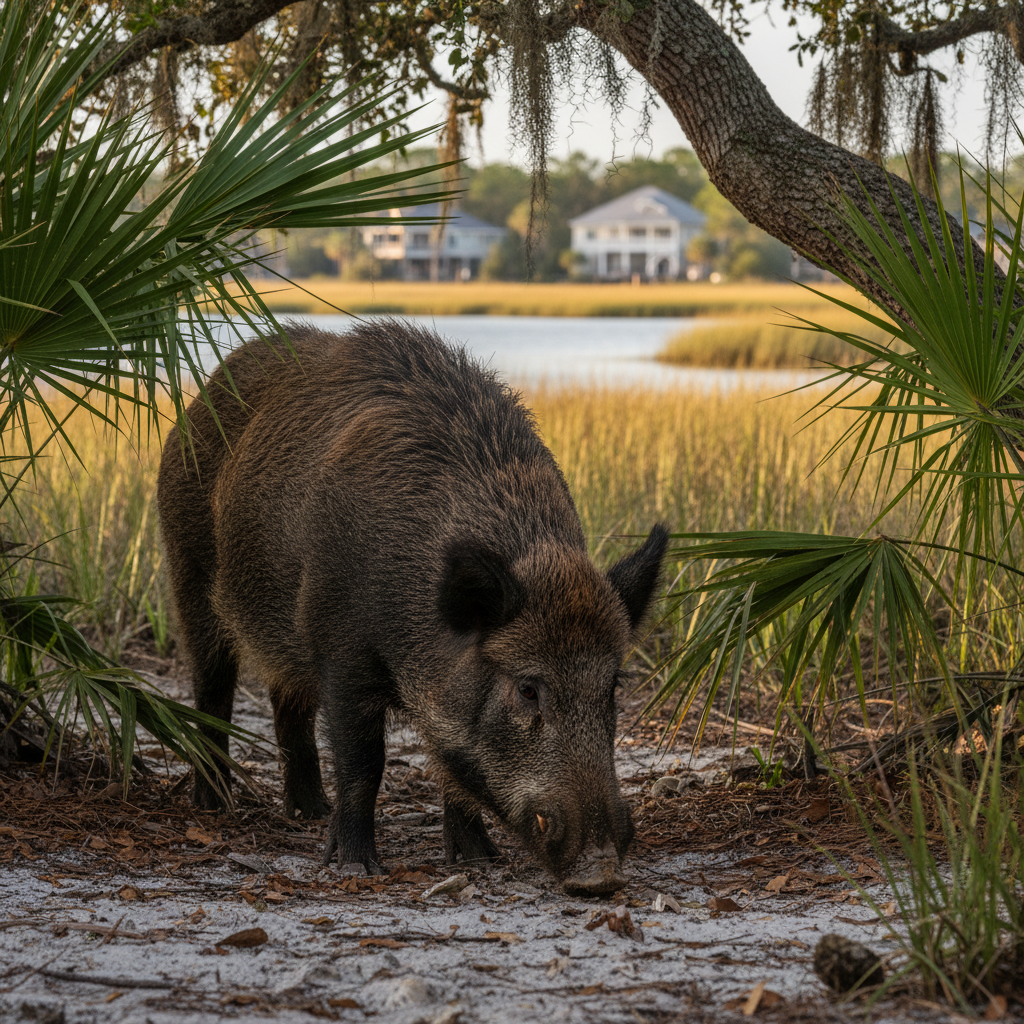 If you encounter a wild boar on your property, remain calm and keep a safe distance. Do not approach or attempt to feed it. Contact the SC Department of Natural Resources or a licensed wildlife removal specialist for assistance with removal. Then call MBPC to assess any potential property damage.