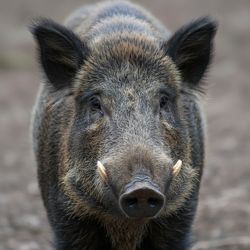 Wild boars are stout, pig-like mammals with coarse, bristly hair that is typically dark brown or black. They have a long snout, small eyes, and prominent tusks (especially in males) that protrude from the sides of their mouth. Adults can weigh between 100 and 300 pounds, with some exceeding this weight.