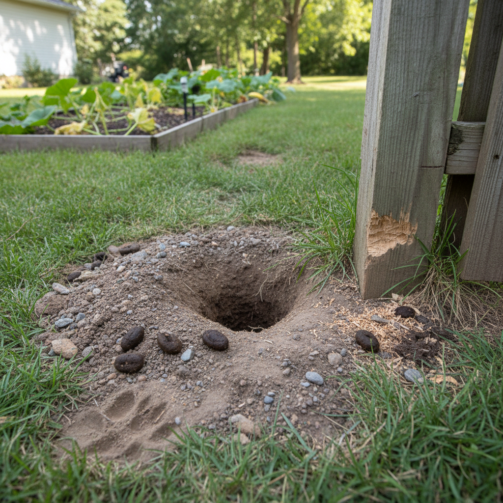 Look for large burrow entrances, typically 10-12 inches in diameter, often located near foundations, under decks, or in open areas. Woodchucks may also leave behind piles of excavated soil and gnawed vegetation near their burrows. Damage to garden plants and landscaping is also a common sign.