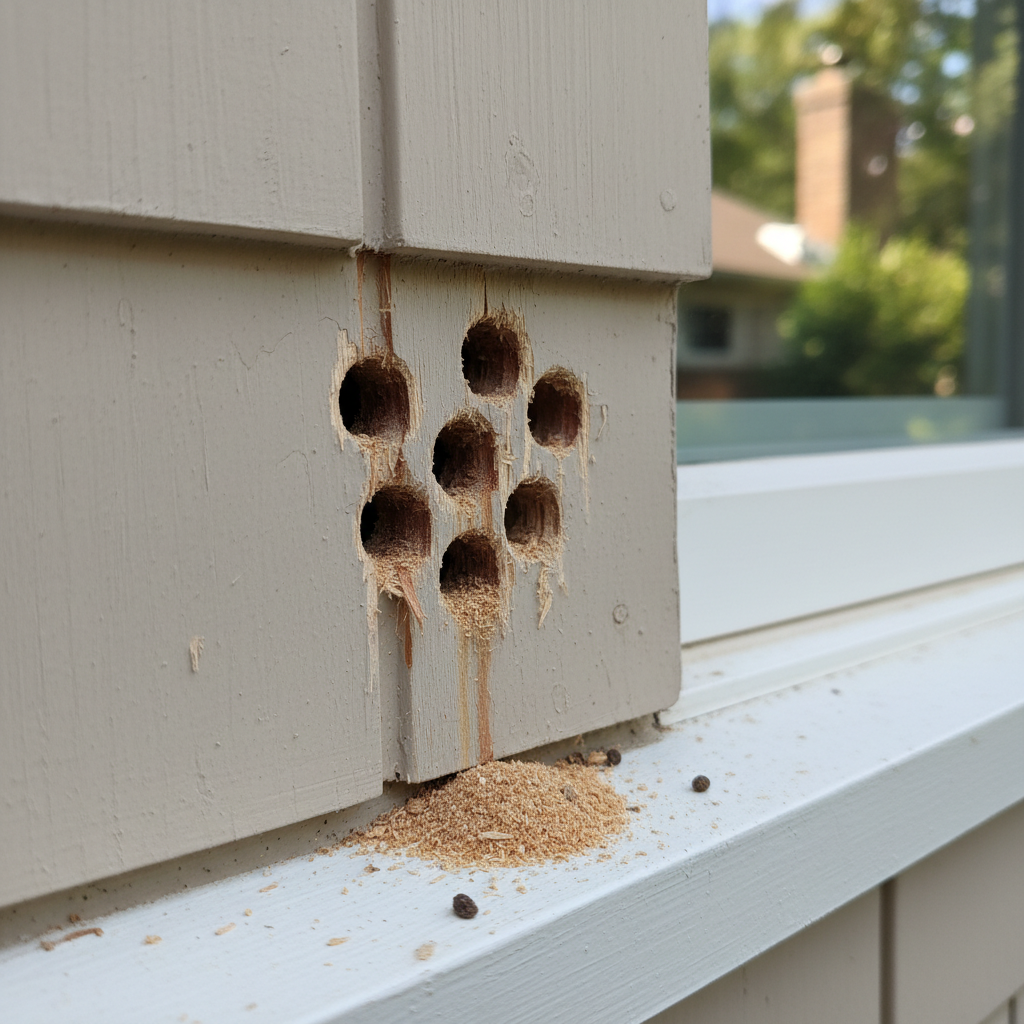 Look for small, evenly spaced holes in siding, fences, or wooden structures – this is a telltale sign of woodpecker activity. You might also notice increased drumming sounds early in the morning, or see the birds actively pecking at your home in search of insects or nesting sites. Damage is most common on cedar or wooden siding.