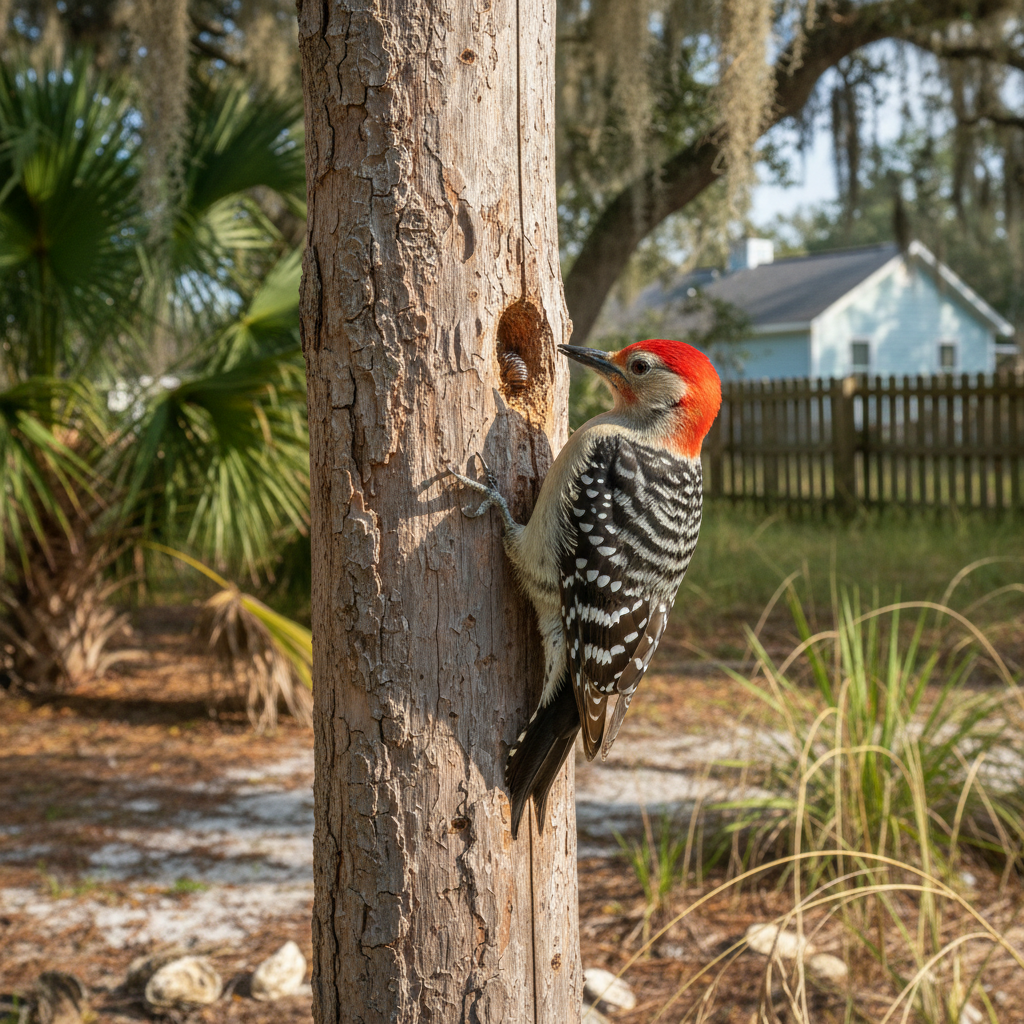 Woodpeckers are commonly found throughout the Myrtle Beach area, including residential neighborhoods and wooded areas near salt marshes and tidal creeks. They are attracted to trees and wooden structures, seeking insects or suitable nesting sites. Our humid subtropical climate provides ample insects for them to feed on year-round.